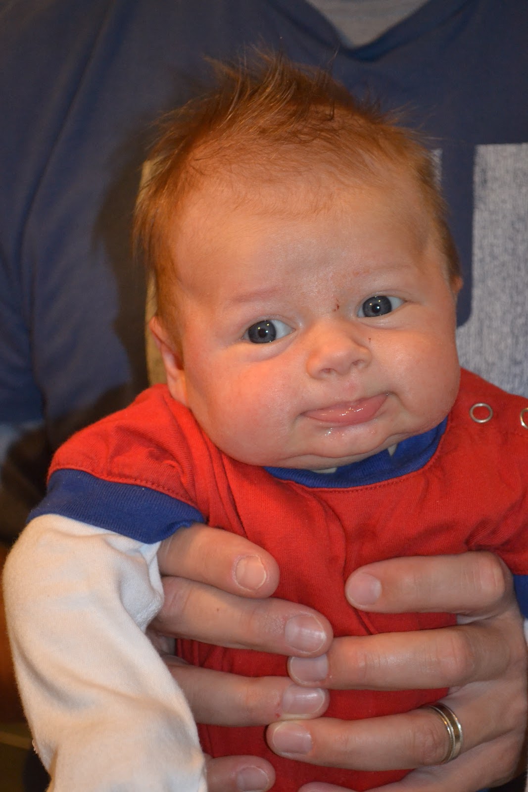 His hair has thinned and what’s left is really long, wispy and sticks straight up. It’s hard to see in this picture but let’s just say Jason calls him Don King. I don’t know if it’s thinning because babies sometimes lose the hair they were born with or because I’ve taken a lot of it out while battling his cradle cap (a whole other adventure) but nonetheless, this is our baby boy ๐ Hard to get a clear picture because he’s always moving. Oh I should mention, he rolled over three times today on his own! Of course I missed it because for the first time in almost 3 months I decided I would finally go get my hair done. Isn’t that just the way things go. But that was very exciting and hopefully we will have prize-winning video footage of that soon haha ๐ He also loves to try and shove both fists into his mouth at once, success with that one WOULD be prize-winning video footage!! ย I mean, he tries and tries. I’ve attempted to tell him they won’t ever fit…