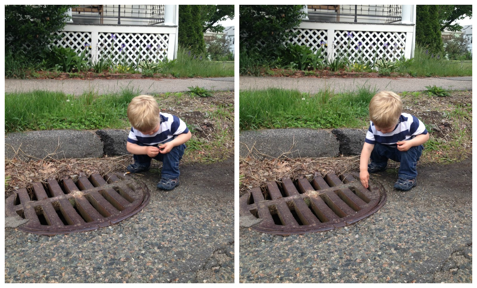 We were having a nice walk, full of adventure 😉 And then, ugh. He stood up on the curb and was walking along it. I took out my iPhone to get his picture but realized my camera roll was full (as it often is). So I flipped through and was quickly deleting to make space for new ones and that’s when he fell. 😦 Right off the curb and faceplanted into the street. He split his forehead up by his hairline, scratched the side of his nose and blood was going everywhere. I could not believe how fast it flowed! I stripped his t-shirt and used it to try to apply pressure and get the gravel out of his mouth and nose…he was screaming. It was awful. We were two streets from home and I ran back with a shirtless, bloody toddler in my arms and called Jason no less than 6 times. He ended up coming home from work for 20 minutes to help me clean out the cut (I couldn’t see how bad it was because his hair was matted and he wouldn’t let me near it). Luckily, I did not see his skull gaping through which is what I had braced myself for (I can be, as they say, a bit dramatic). I was praying not to have to go to the emergency room for stitches and aside for the monstrous egg on his forehead, he seemed to be ok. I, on the other hand, was still crying long after Ashton had stopped.