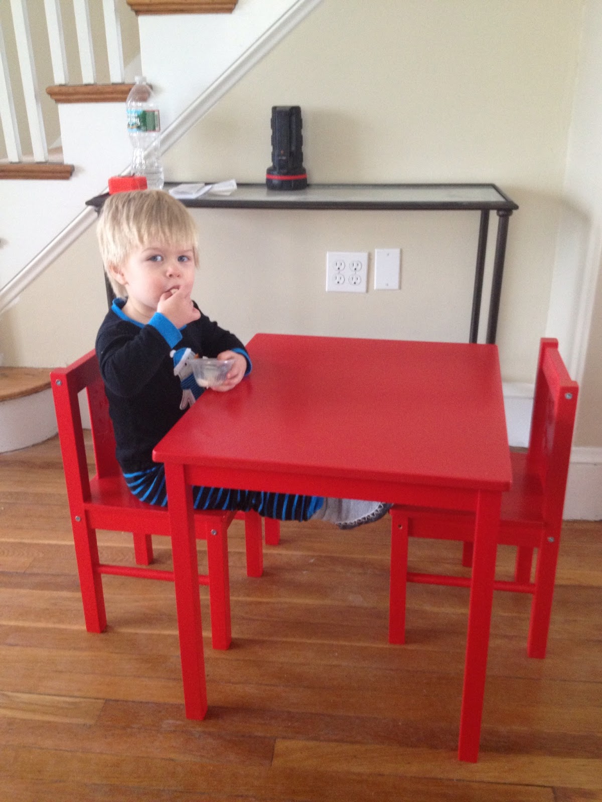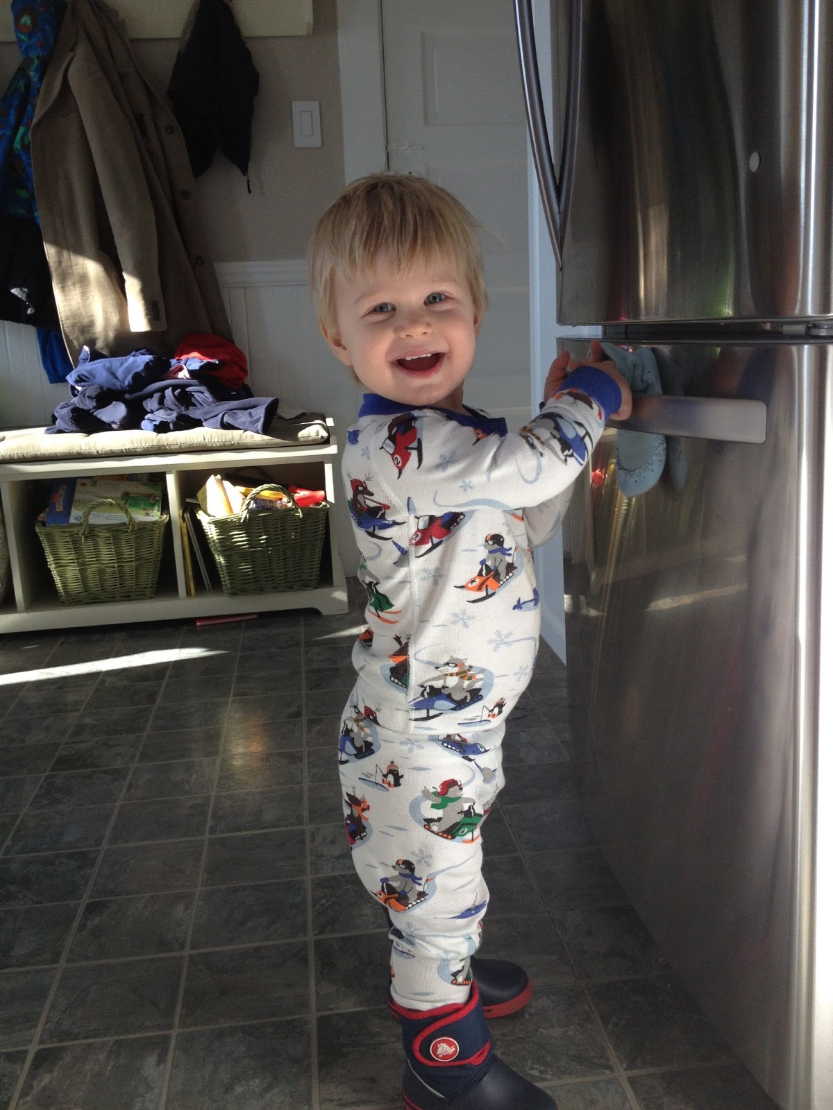 Other likes: trying to stick his fingers in places they don’t belong (like electrical outlets), pressing buttons (literal and figurative ones), and climbing on anything that gets him at least two inches off the ground. Oh, and mirrors and/or looking at pictures of himself. This does not come from me.