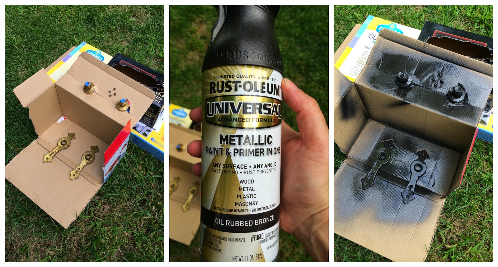 Then I gin up some sort of box-structure that can support the knobs being pushed through from below, leaving only the metal part showing. I punch the screws in, lay the panels, and spray baby spray.
