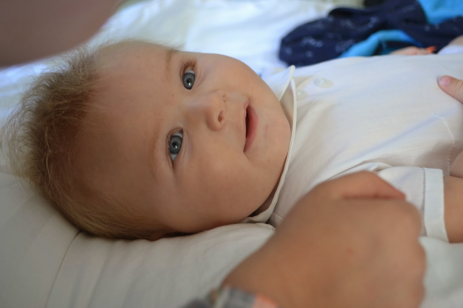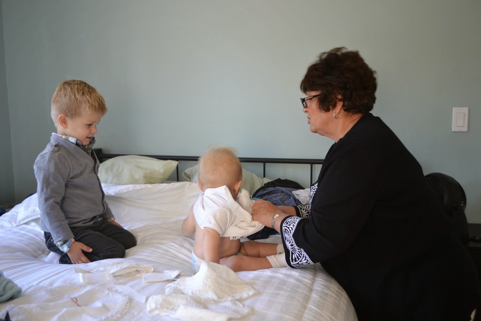 Alex wore the same outfit that Ashton wore, which is the same outfit that Jason wore! As well as Uncle Chris and cousin Owen, so it’s a wonderful tradition. Grandma did the honors and got him dressed.