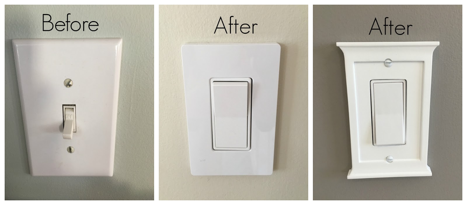 But now, 90% of the switches and outlets in our house have been upgraded. We have one-ways, two-ways, three-ways, dimmers, backlit switches, decorative plates, the works!