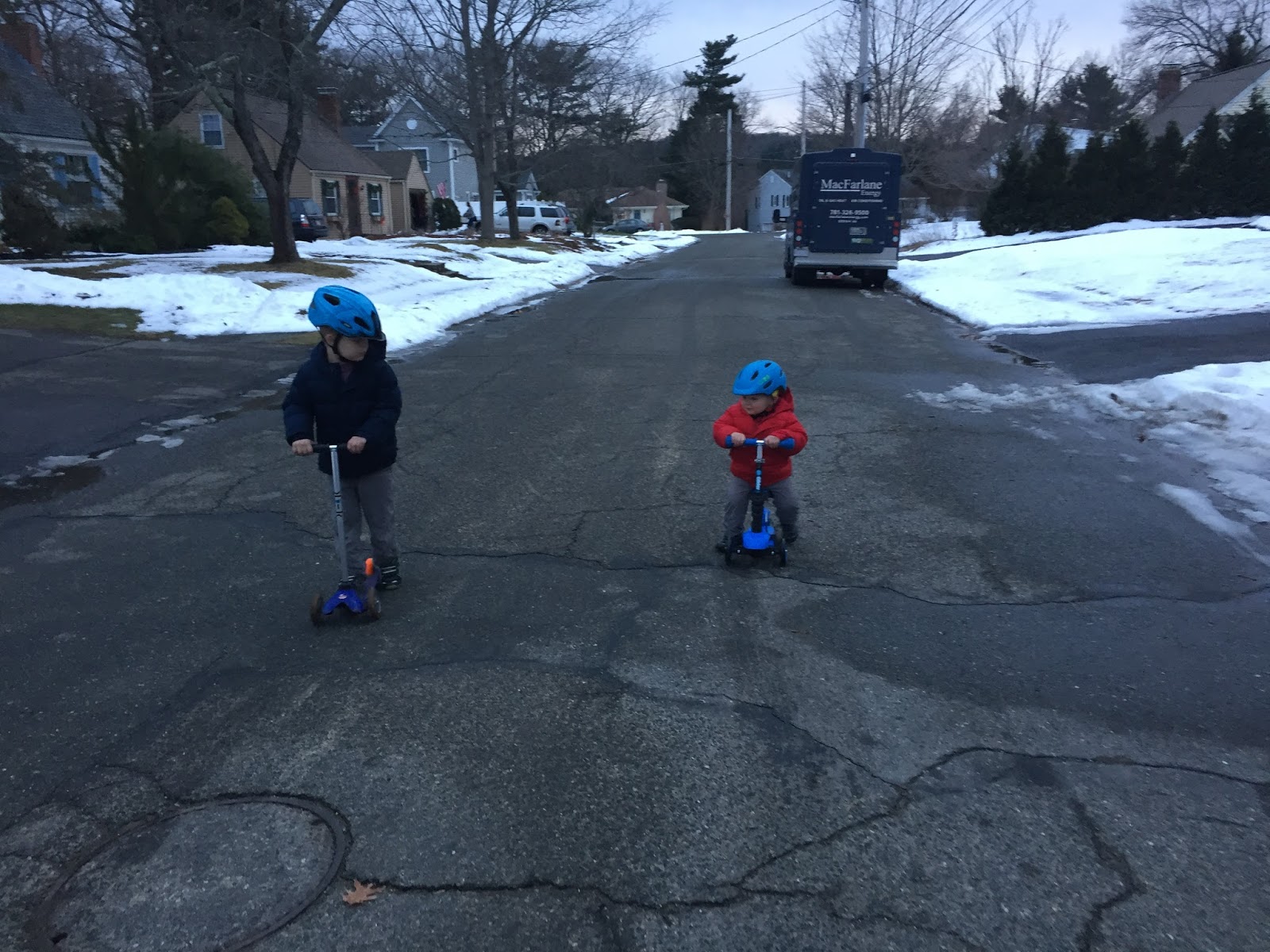 Just putting on boots and stomping around in the leftover snowbanks and mud puddles has been quite sufficient since then. March 13 is not that far away (clocks spring forward!), but we are definitely already seeing longer days. Even though jackets are required, we still scooter and hit the playground!