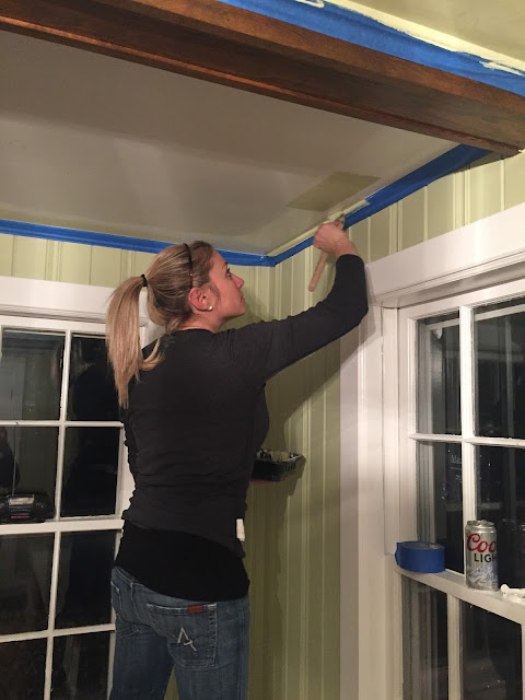So there I was. The ceiling is 6 big squares and then a few small ones, all separated off by the beams. We had put sample color blocks in a few spots to try and figure out if we should do it at 25% or 50% of the wall color (50% was the winner – the color is Shagreen by SW) but other than that, it was a blank slate. I started by trying to cut in using just the brush and my impeccable skill, but after roughly 45 seconds I realized I needed the painters tape and I needed it bad. Is that cheating? Oh well. I took a break to tape the moldings and beams off. (And yes, I absolutely made Jason take my picture! This was history happening.)