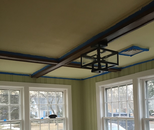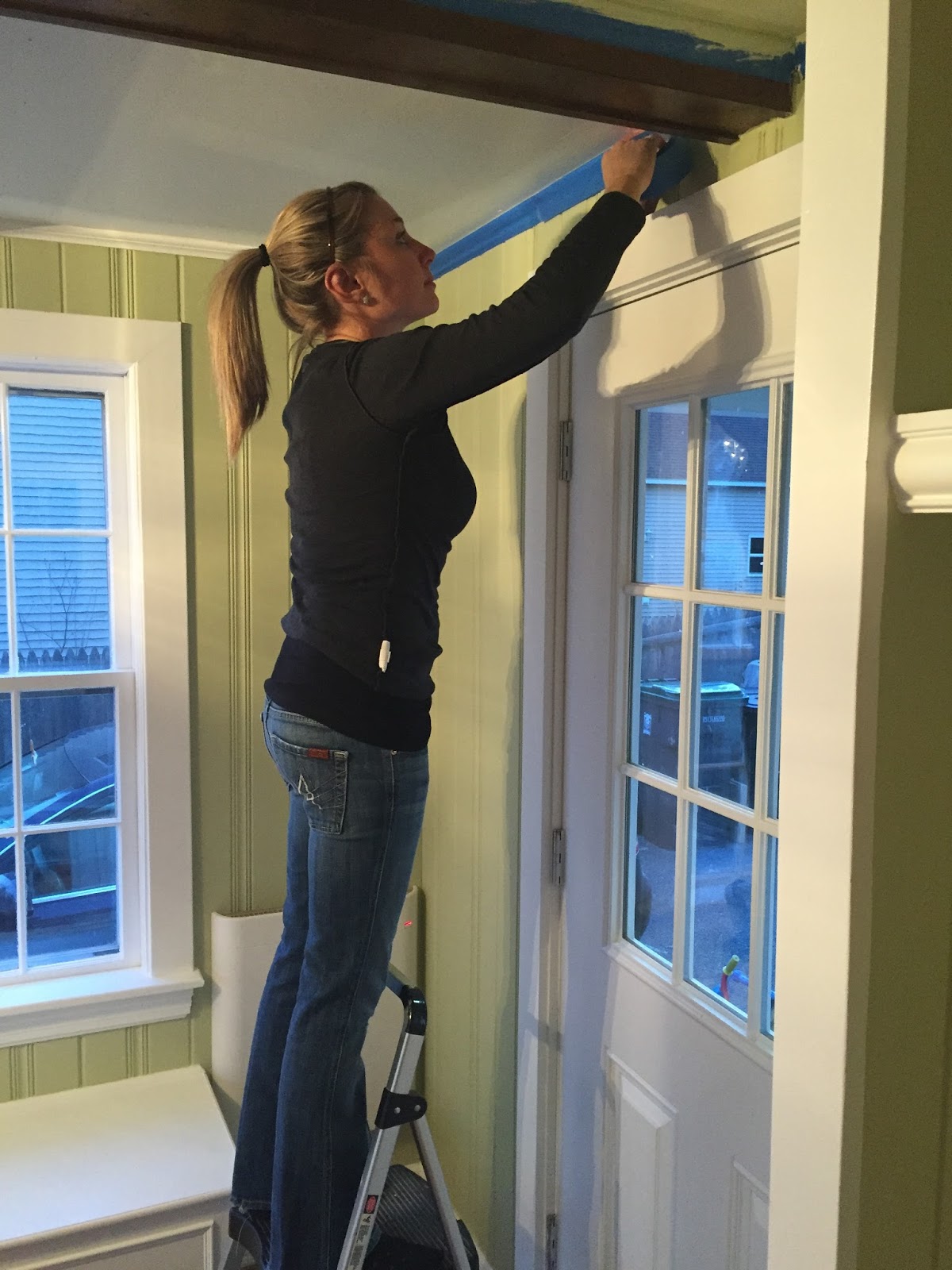 So there I was. The ceiling is 6 big squares and then a few small ones, all separated off by the beams. We had put sample color blocks in a few spots to try and figure out if we should do it at 25% or 50% of the wall color (50% was the winner – the color is Shagreen by SW) but other than that, it was a blank slate. I started by trying to cut in using just the brush and my impeccable skill, but after roughly 45 seconds I realized I needed the painters tape and I needed it bad. Is that cheating? Oh well. I took a break to tape the moldings and beams off. (And yes, I absolutely made Jason take my picture! This was history happening.)