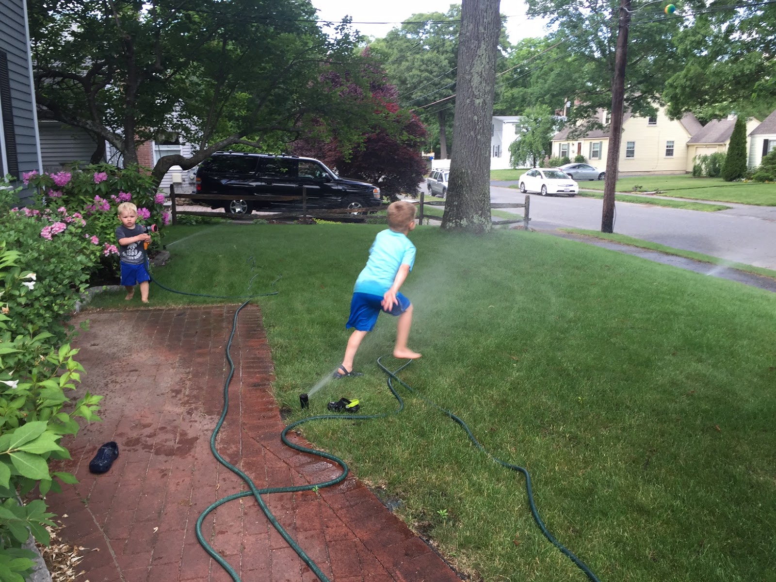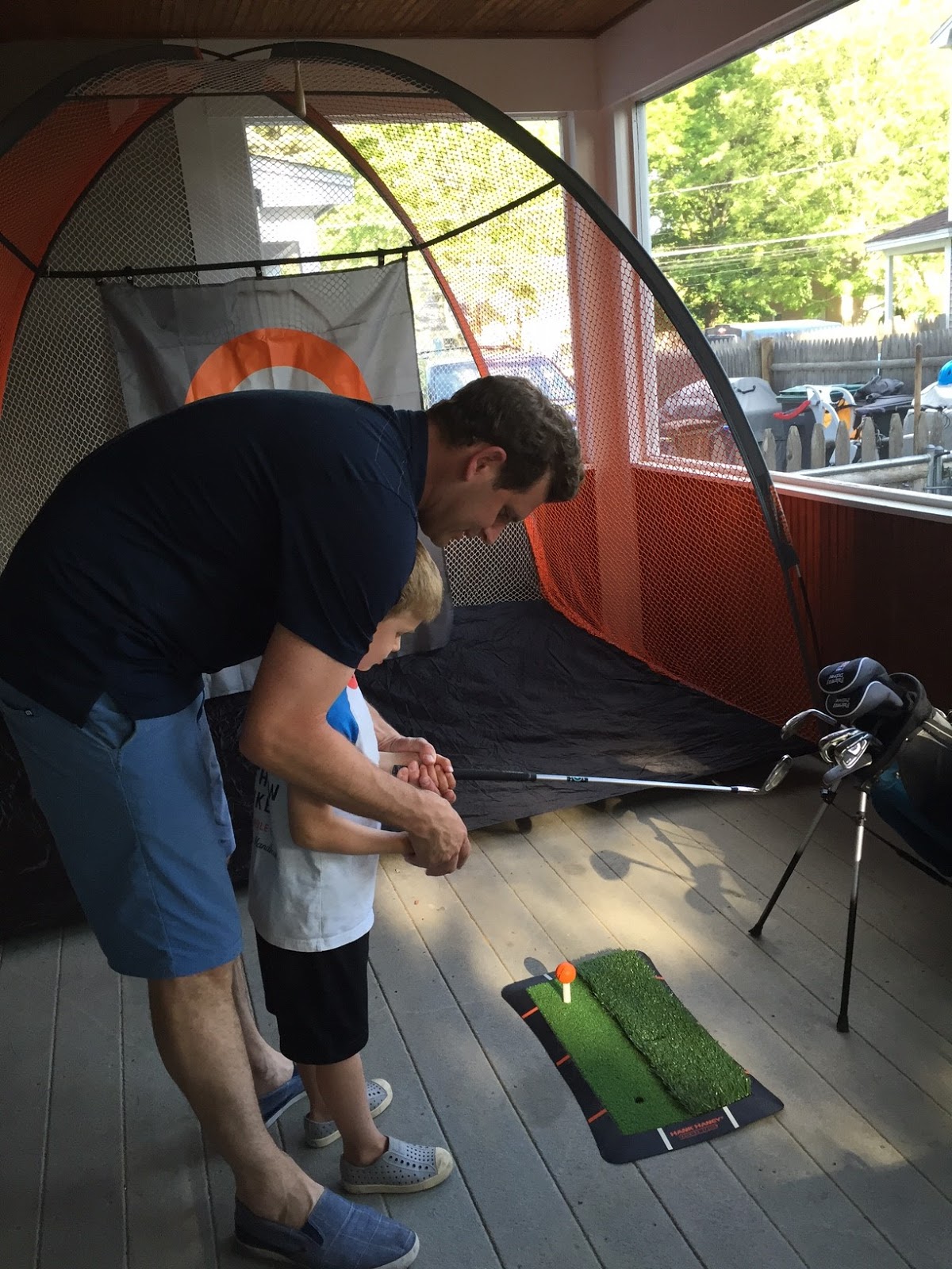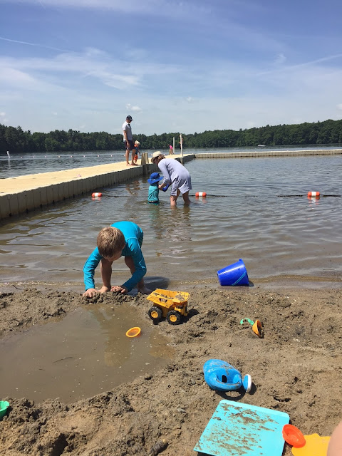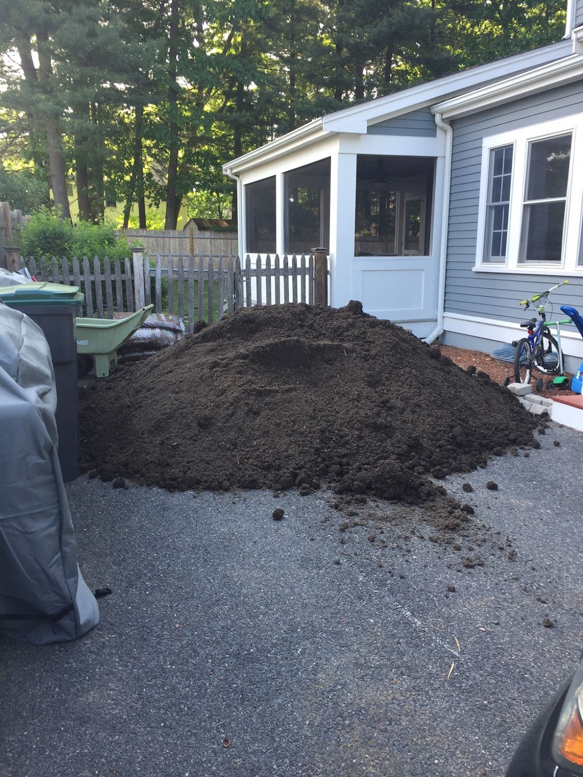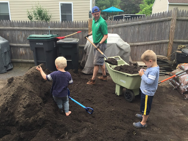 And we move on! June has been good so far – we “fished” for minnows at Wayland Town Beach (which is going to fulfill all the sun/sand/water needs of the season), Jason had 5 cubic yards of soil delivered to seed our lawn and make our garden (a very exciting highlight that I am still cleaning up after), the hose is out in full force, we have popsicles after dinner, ride our bikes, hunt for bugs and generally play play play! Oh, and Jason set up a huge golf net on our screened in porch. He got the boys real clubs too! Just what I need.Â