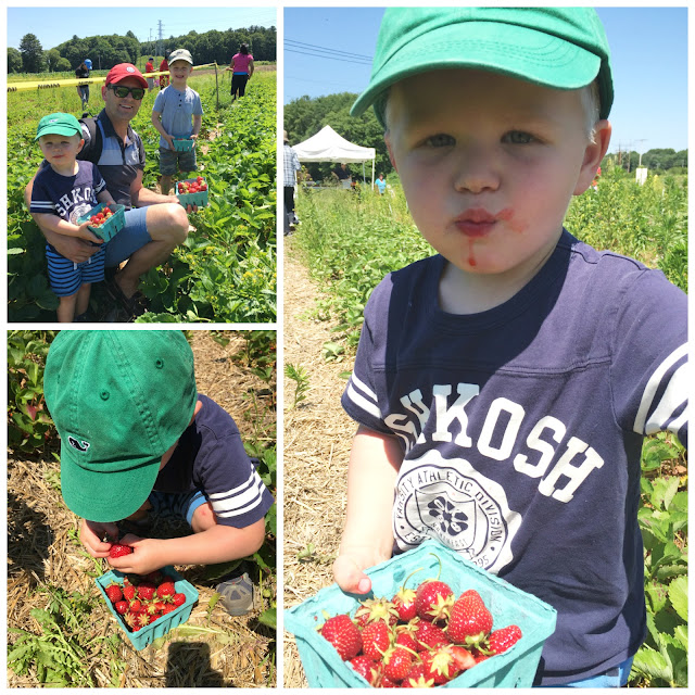 So we have that, plus now the u-pick season is upon us and there are any number of places that are also super close! We went to Sunshine Farms in Sherborn last Saturday for some good old strawberry picking. They had a hayride that took you out to the field so you didn’t have to exert yourself before toiling away under the blazing sun. Jason took it upon himself to pick outside the lines and the boys had tell-tale red juice dribbling down their chins. They were so lucky to have us 😉