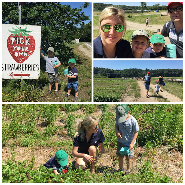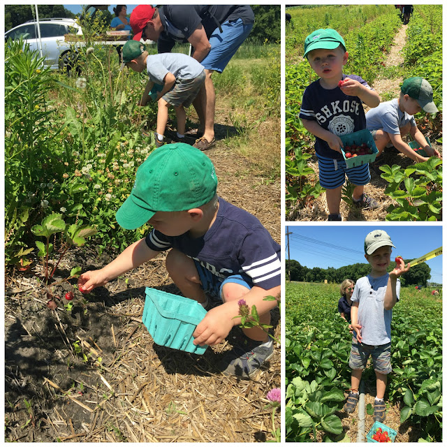 So we have that, plus now the u-pick season is upon us and there are any number of places that are also super close! We went to Sunshine Farms in Sherborn last Saturday for some good old strawberry picking. They had a hayride that took you out to the field so you didn’t have to exert yourself before toiling away under the blazing sun. Jason took it upon himself to pick outside the lines and the boys had tell-tale red juice dribbling down their chins. They were so lucky to have us 😉