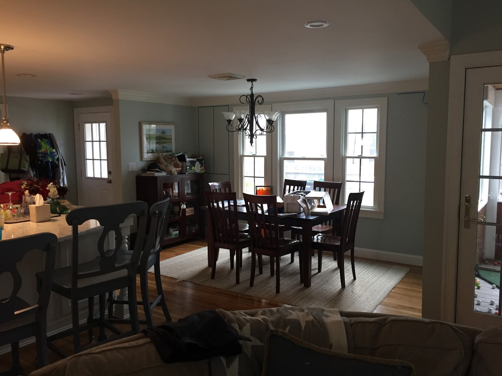 So the “new main living area” is one big open space that includes the kitchen, family room and dining area, which is off to the side that looks out over the top of the driveway. It is framed by two doors – one leading outside (left one) and one leading out to the screened in porch (right one):