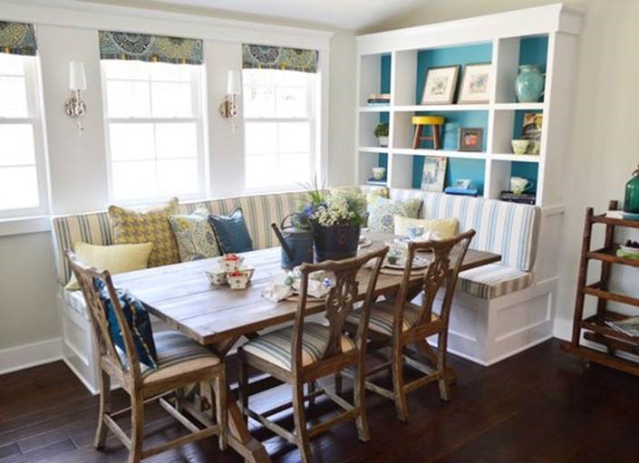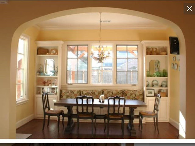 We are going to put floor to ceiling cabinets on either side of the windows and connect them with a bench seat that runs the entire length under the windows. Akin to: