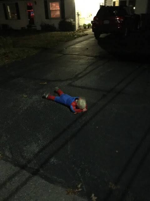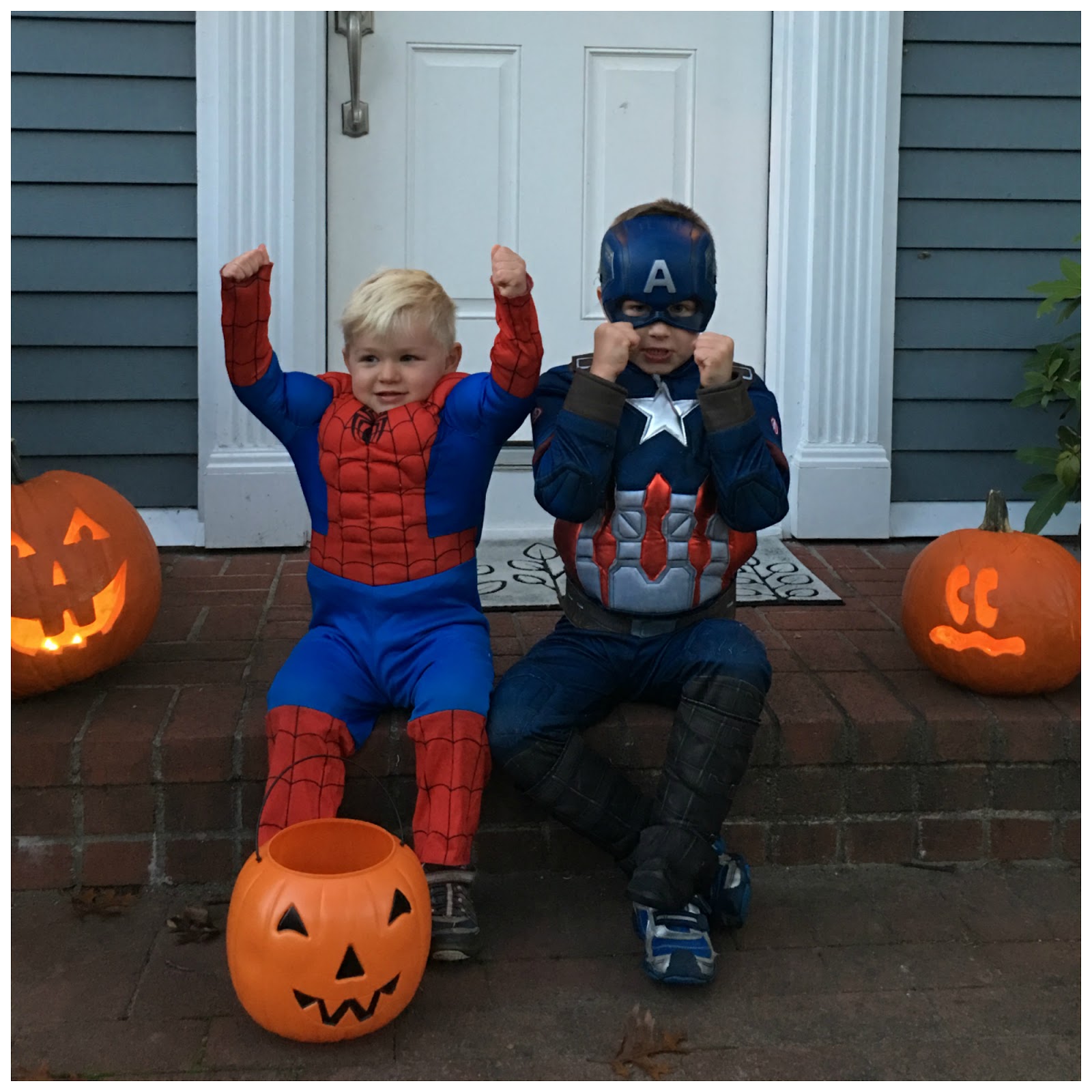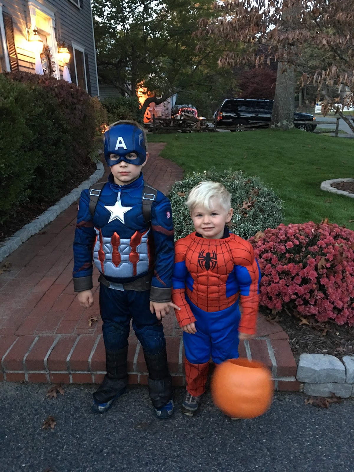 For awhile after that, Ashton wanted to be some kind of dragon/ghost combination. Specifically, a half of each. Then, he thought he could go as a lightbulb. After that, a witch (I corrected him, “You mean warlock” and he said “No, I mean witch.”). Finally, they settled on the most original costumes ever in the history of little boys on Halloween: superheroes. Captain America and Spiderman, to be specific.