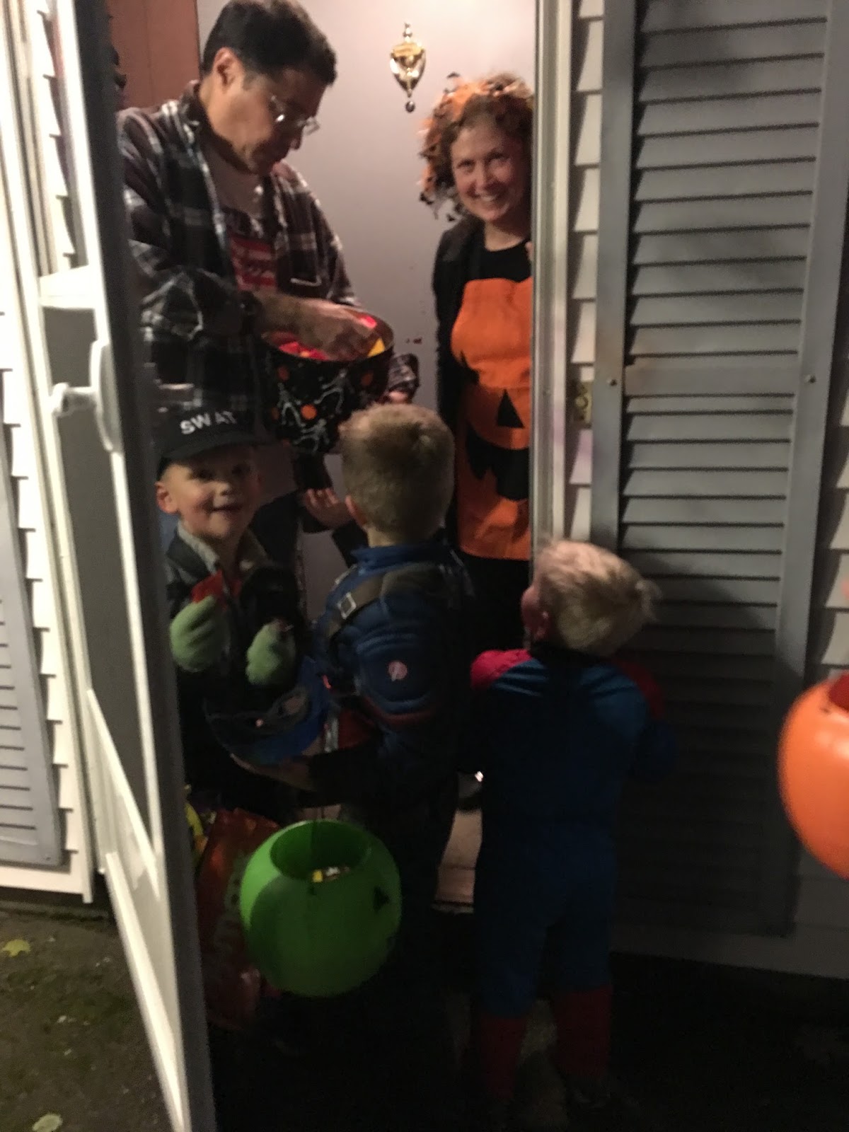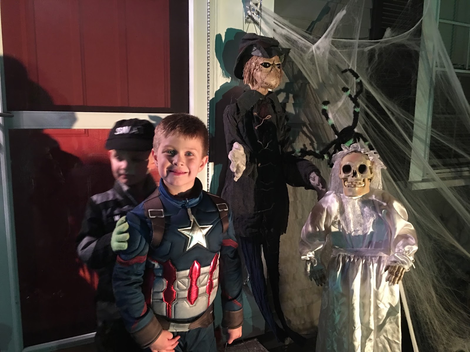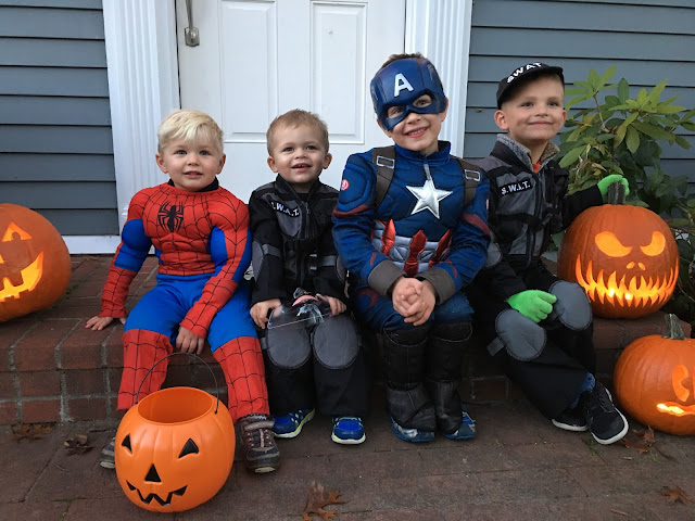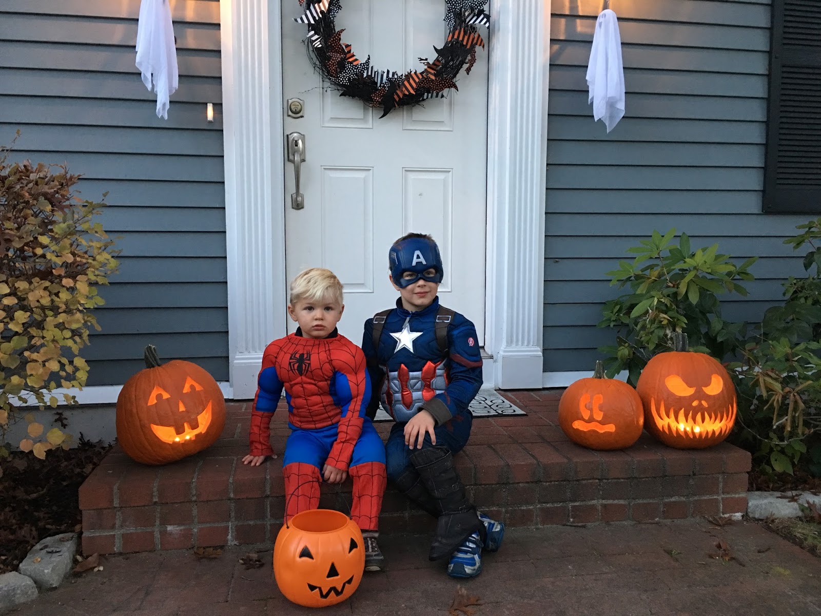 For awhile after that, Ashton wanted to be some kind of dragon/ghost combination. Specifically, a half of each. Then, he thought he could go as a lightbulb. After that, a witch (I corrected him, “You mean warlock” and he said “No, I mean witch.”). Finally, they settled on the most original costumes ever in the history of little boys on Halloween: superheroes. Captain America and Spiderman, to be specific.