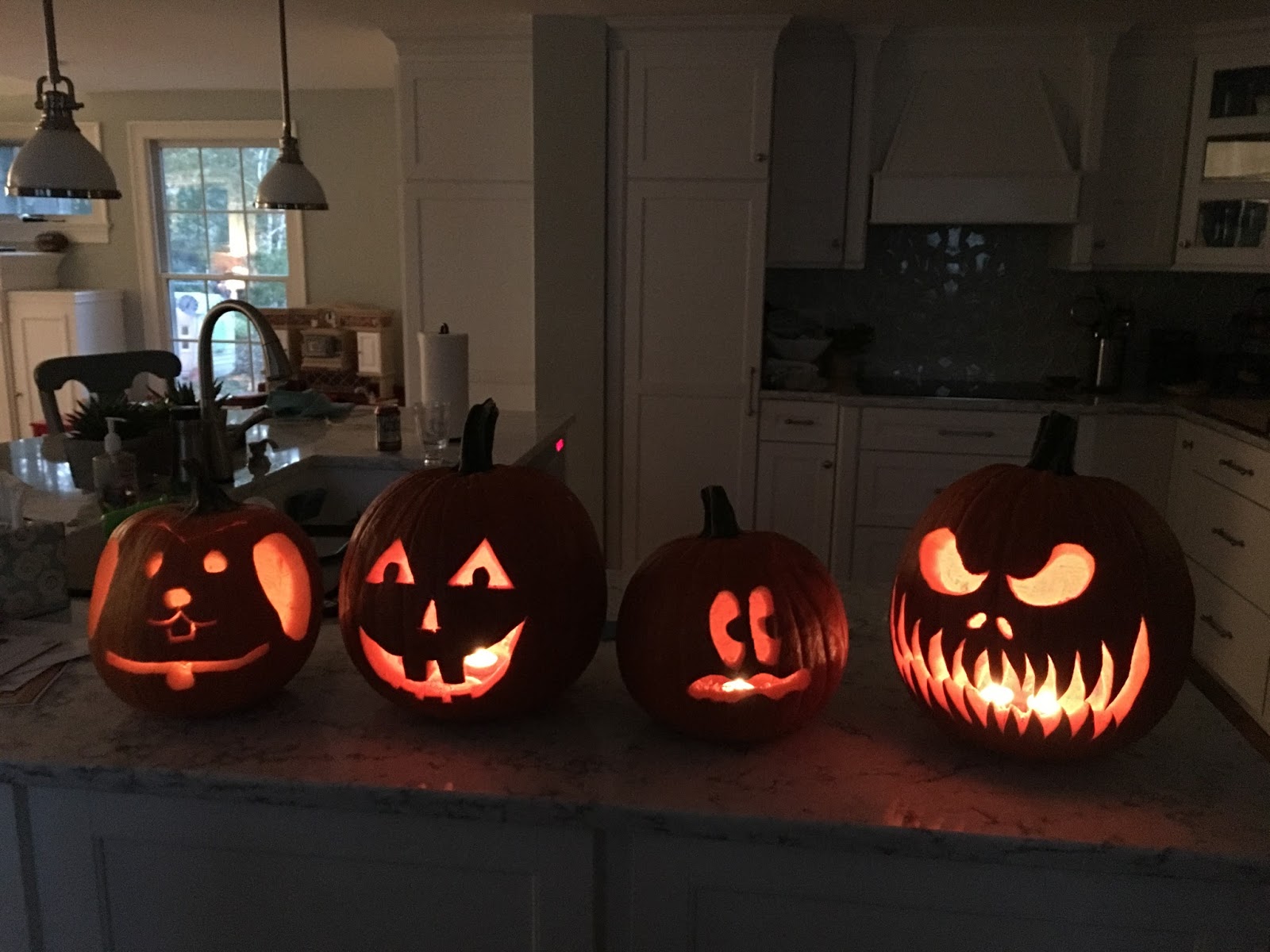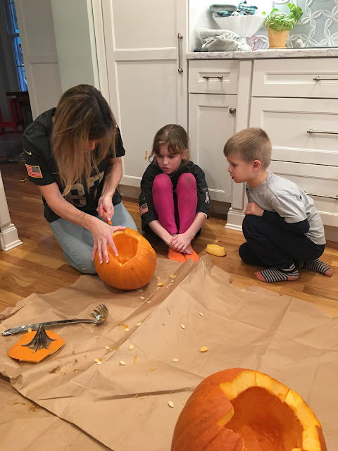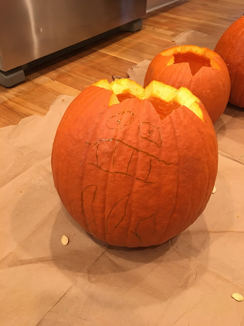 On Sunday afternoon Kayleigh and her mom (our neighbors) came over and we all got to work scooping out the guts and drawing our faces.