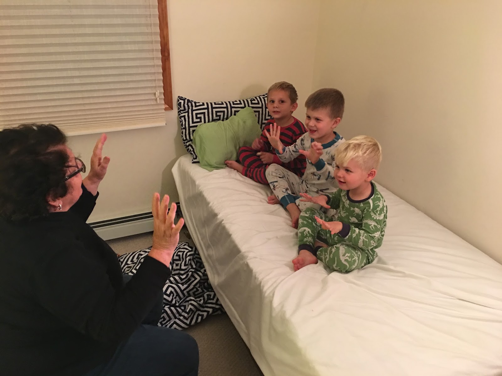 We left the boys with Grandma and Grandpa allllllll daaaaaaaaay (insert fireworks and cheering). Actually it was funny, on Sunday morning Jason and I were heading out, packing up the final car stuff and Alex came running over to me. I bent down because I thought he wanted a goodbye hug, but he pushed me and said “Go ‘way Mommy!” I was like geez, I’m going, I’m going! I guess the feeling was mutual 😉 But the boys got to go to McDonald’s for lunch, on the big carousel in Greenport, and spent time with their cousin Owen who they love. Bedtime songs with Grandma: