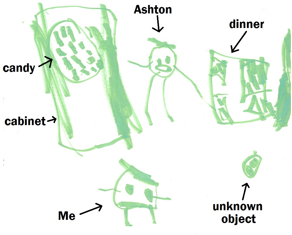 “Mommy! Let me tell you what this is. This is me right here, see? In the middle. And then this is my dinner on the counter that I’m eating. Yes, that’s my dinner and this, on my other side, is the cabinet with my Halloween candy in it. And I’m telling you that I am all done with my dinner and I really, REALLY want a special treat from the cabinet and here is you and you are not happy and you are saying no to the candy because I didn’t eat any dinner and you spent a lot of time making it. You really are not happy, see Mommy? See? This is you.”