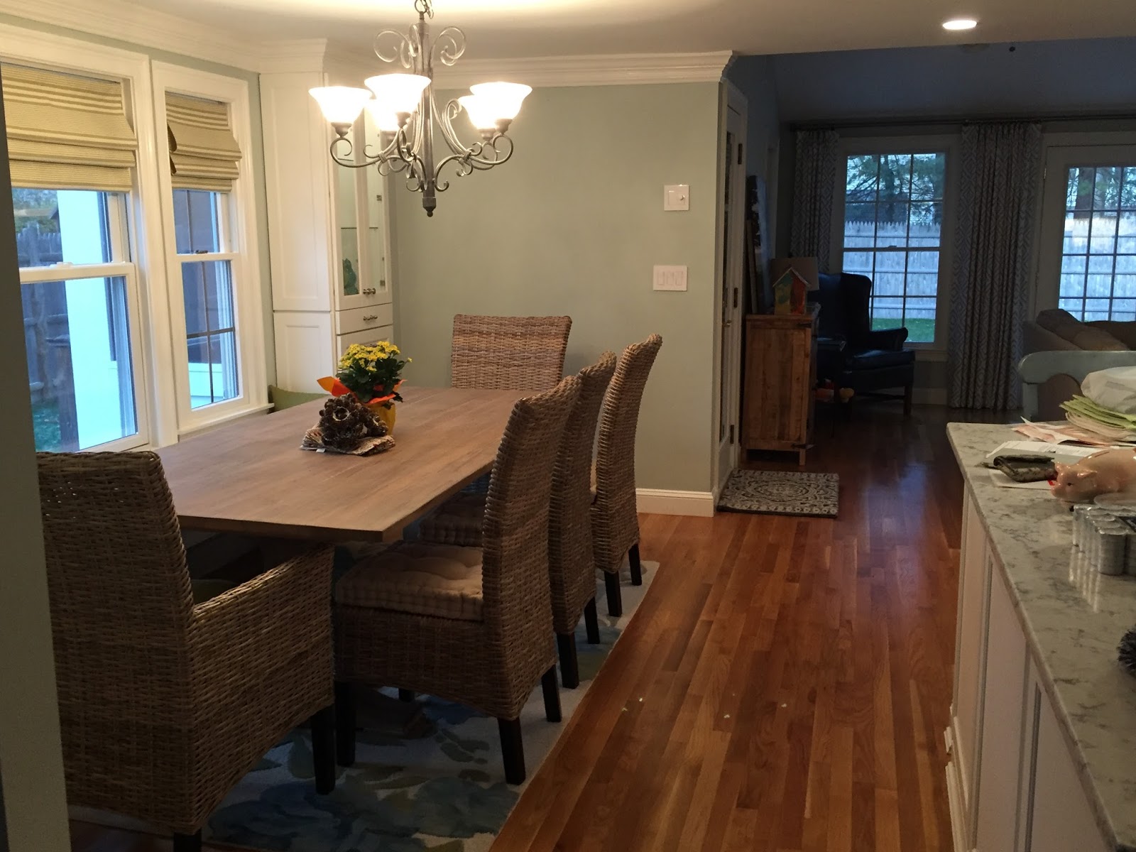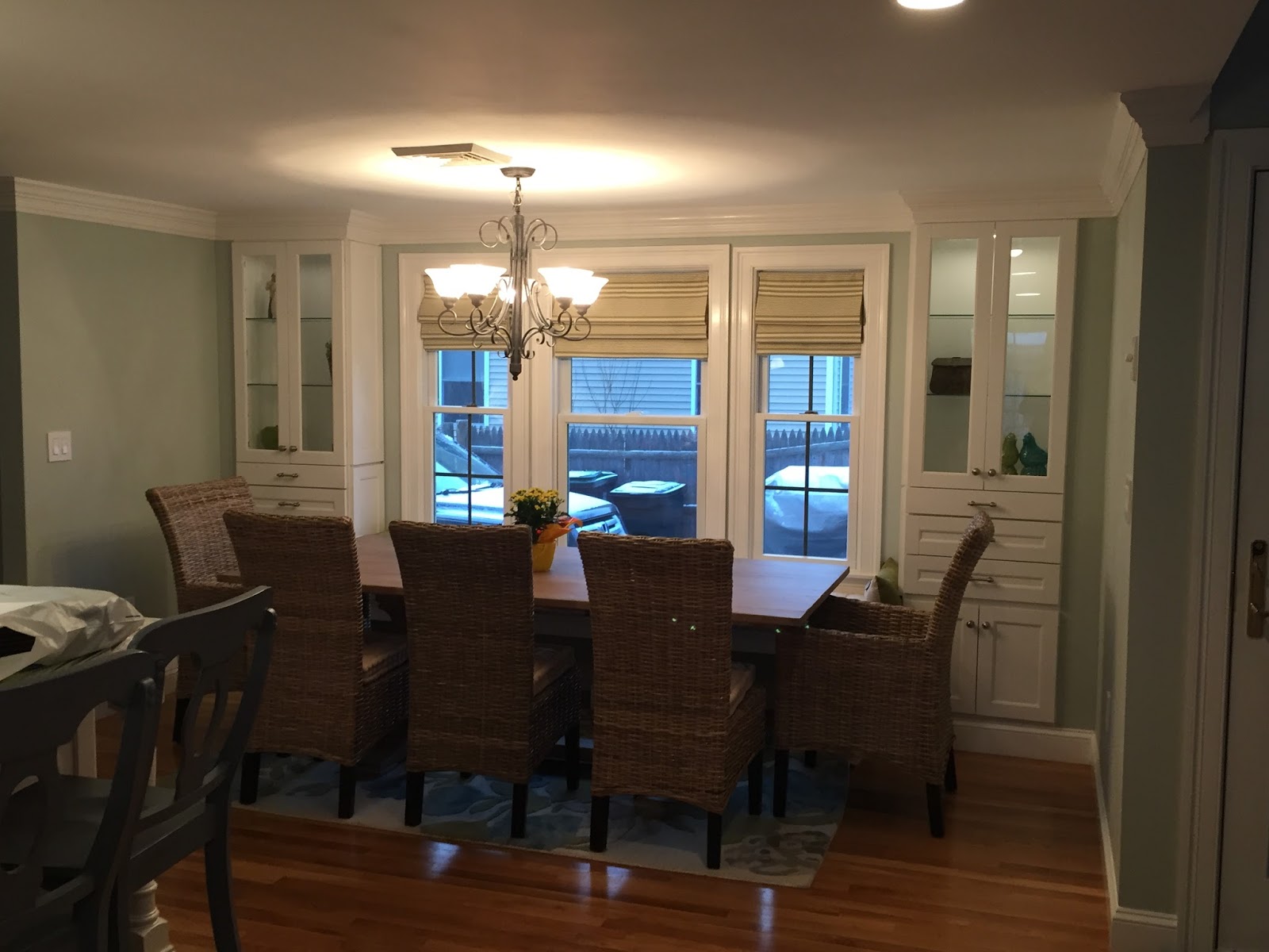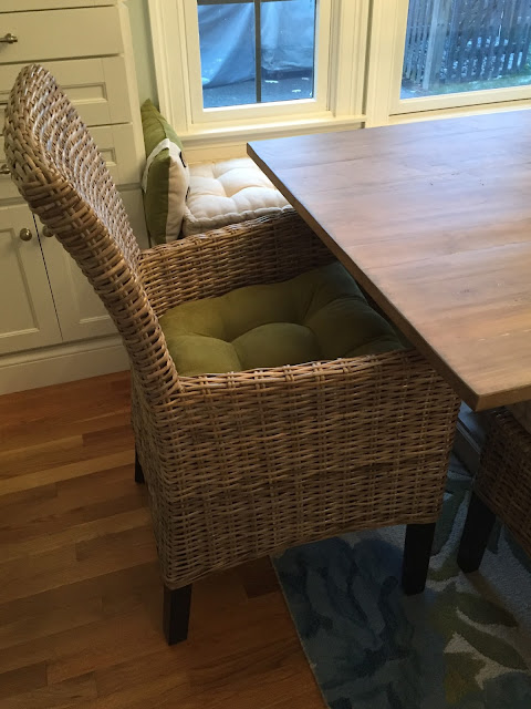 General notes: we got pretty much everything from Pier 1 – the side chairs, arm chairs, cushions and rug. The bench cushion especially was a tough call for us because to have one custom made would have been $550+, including the cost of the fabric. Pier 1 made a great boxed cushion for $80, so we bought two and added a pillow to the ends to make up the extra inches we needed. I think it works! We also bought an extra side chair, we can technically seat 10 now with 4 on each side.