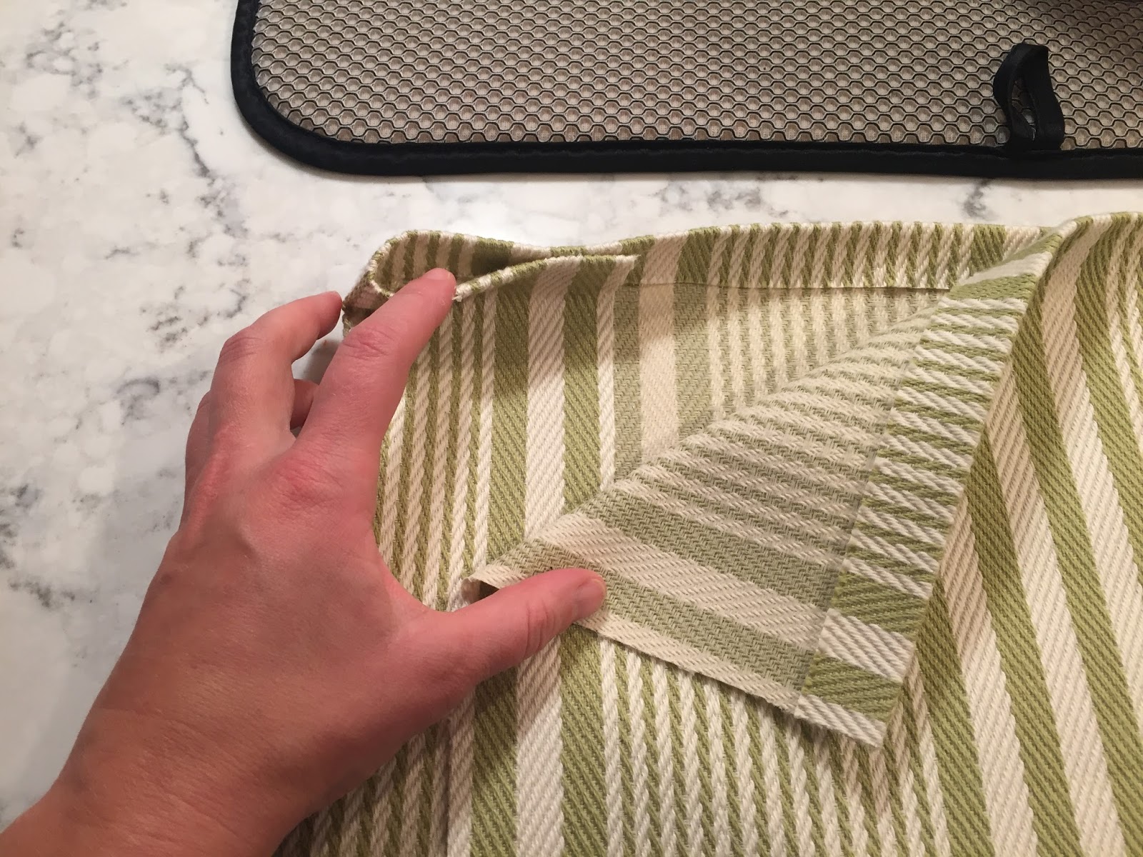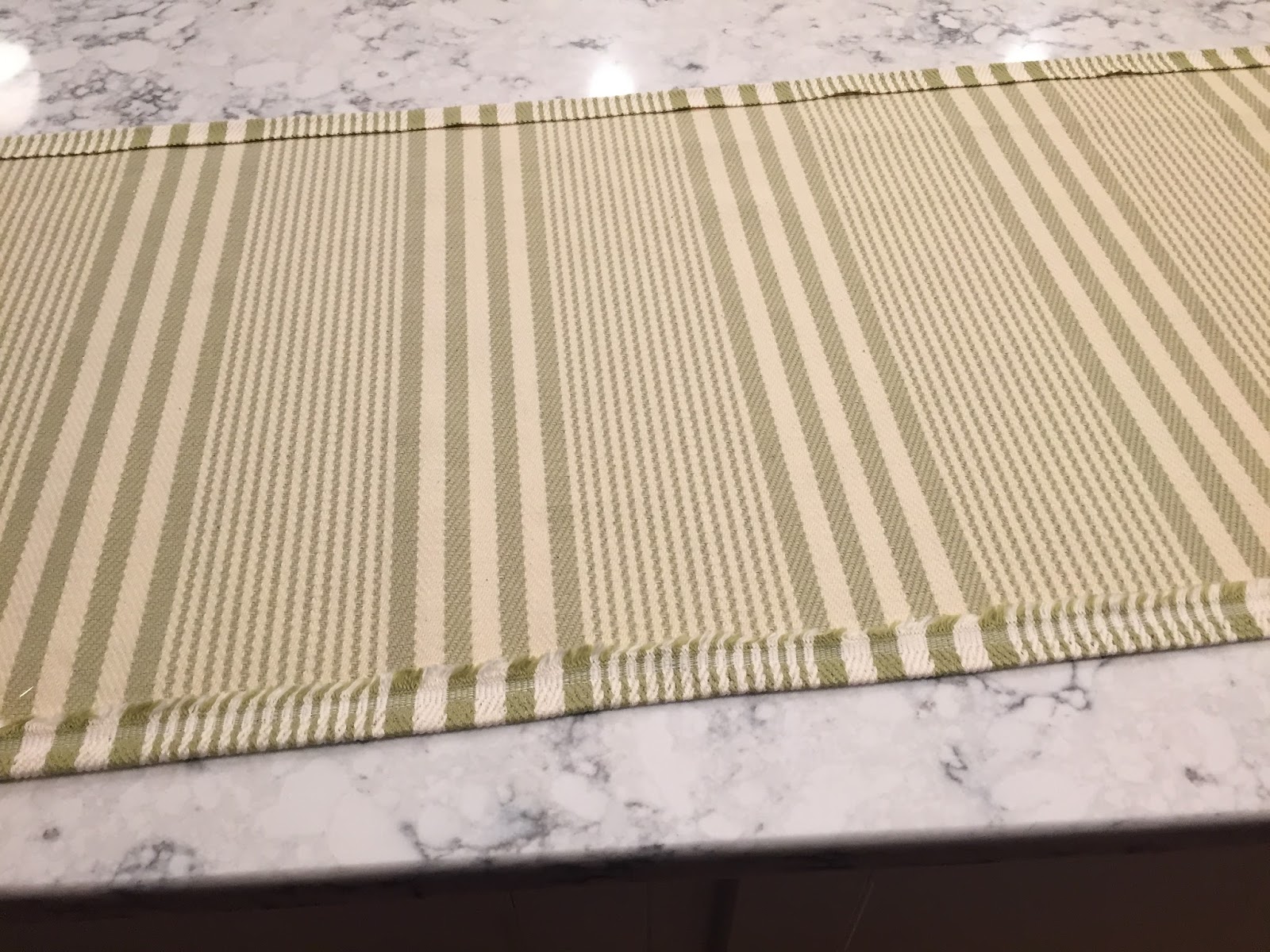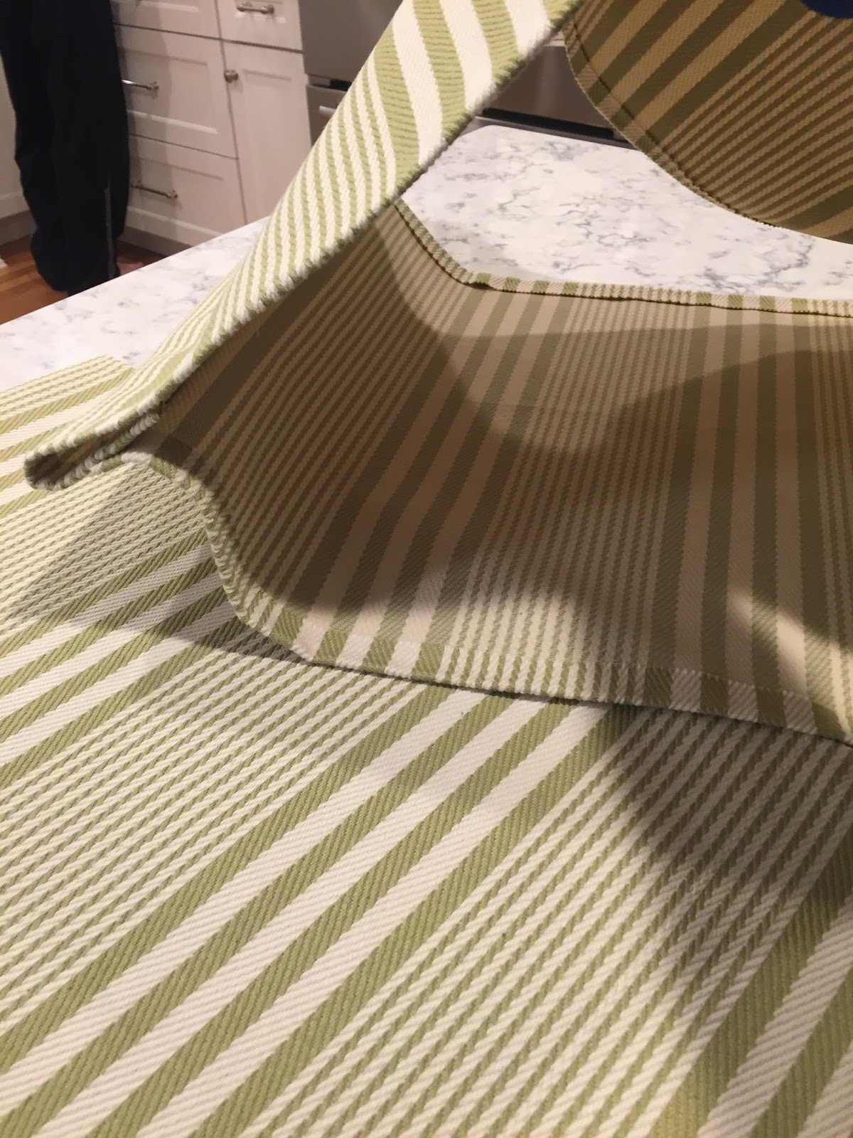 The color is a green stripe, hard to tell. I followed this tutorial for the most part, but used hot glue for the seams. It was so simple! You basically cut your fabric, glue the sides, glue a loop at the top, and then glue the bottom to the loop to make one continuous piece.