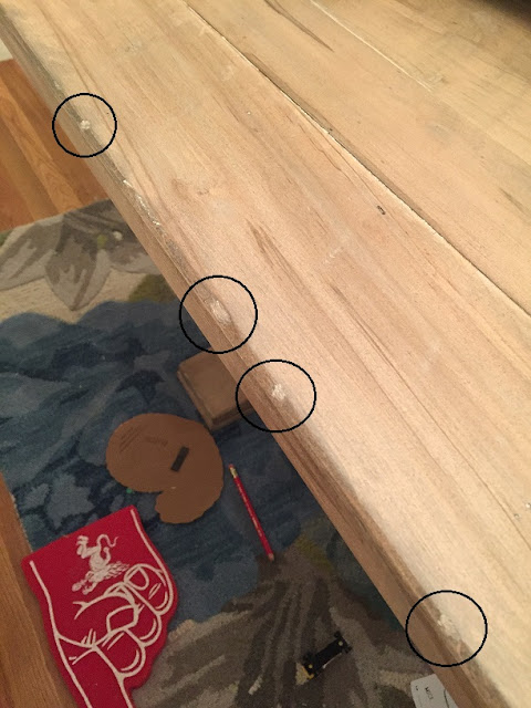 This table was selected for one very important reason: it is distressed. And since it is already imperfect, I cared slightly less when THE BOYS TOOK THEIR TOY TOOLS AND PRACTICED SAWING ON THE EDGE.
