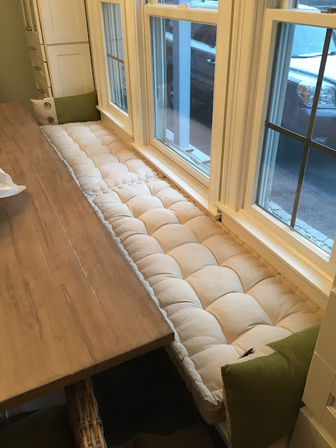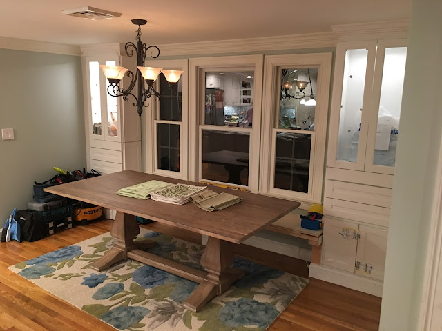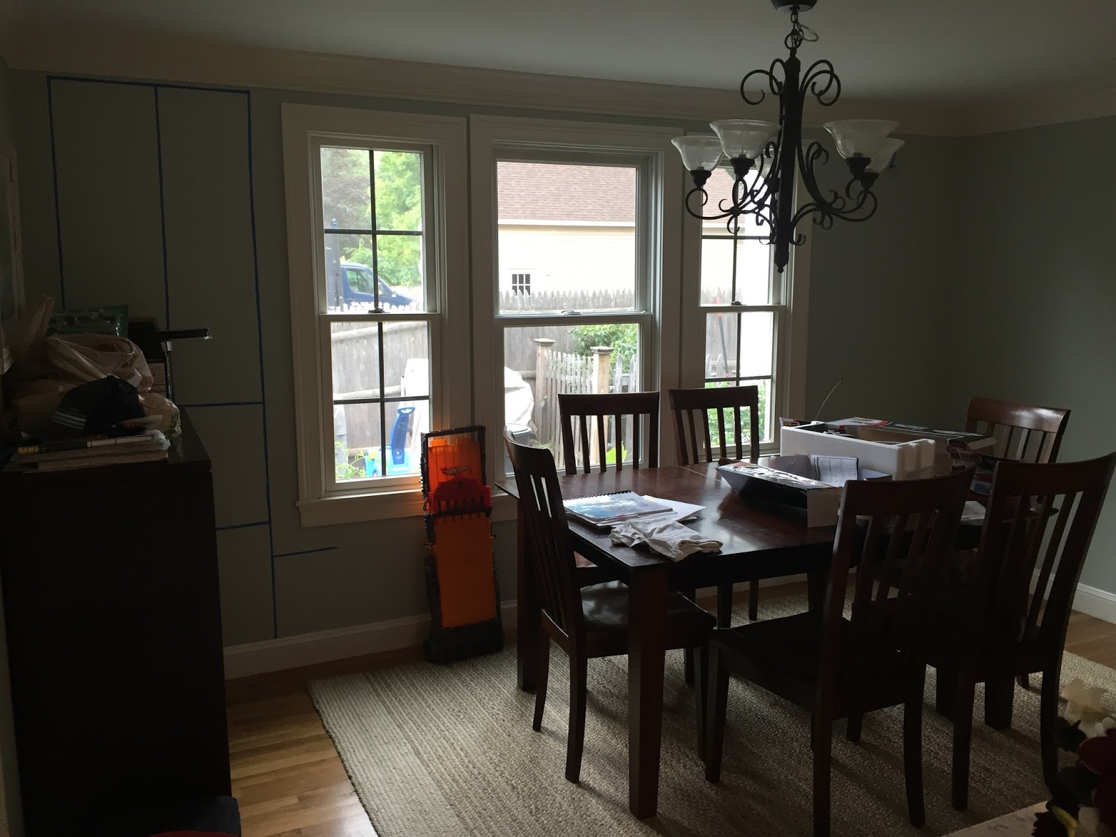 We began knowing that we were going to build a bench seat under the windows. It was a good space saver and gave us a guide for how big a table we needed (most days, we will just have three chairs on one side and the bench on the other- the armchairs on the ends will live in the basement). We also knew we wanted a pedestal or trestle table in order to avoid people hitting table legs as they slid in and out of the bench.