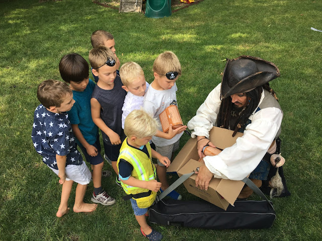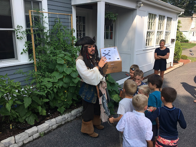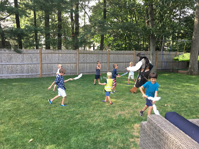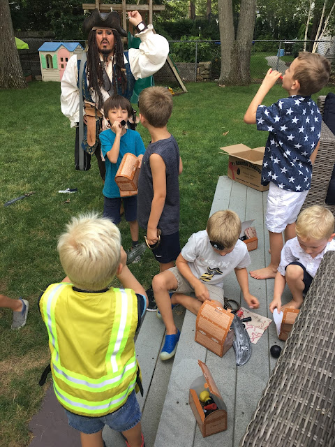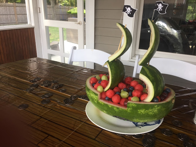 Ashton is obsessed with treasure and jewels. He has any number of small boxes that he collects things in – stray sequins he finds, buttons, pebbles, bolts, beads, tokens, anything. It did not take me long to decide to throw a pirate themed party for him. Mind you, it was nothing like last year. This one was super small and it was a drop-off! No parents meant no one to impress with decorations 😉 We did it in the afternoon so there wasn’t a huge food commitment AND I hired a Jack Sparrow lookalike to entertain the kids! (They haven’t seen any of the movies but easily recognized that he was a pirate.) It turned out to be a winning combination and I was practically stress-free. I ordered some swords and eye patches, carved a ship out of a watermelon, hung some balloons, and organized a treasure hunt for their favors but that was about it and it was glorious. Captain Jack was worth his weight in gold (no pun intended! HAHA). Not only did he look just like Johnny Depp, he even had the same voice and accent. He gave some swashbuckling lessons, played Simon Pirate Says, taught them about the code on the high seas, and best of all, they sat down in a circle for a Pirate Q&A and the kids could ask him any question they wanted. “Can you breathe underwater?” “Can you swim faster than a shark?” “Do you have real eyes?” and of course, because they are boys, “Where do you poop on a pirate ship?” They just kept going, it was priceless. [Captain Jack overall made quite the impression – the next night my friend texted me that he was all her kids could talk about and one of them kept pondering over and over, saying “I can’t tell if Captain Jack was a real pirate or just dressed up like one. He really seemed like one but why would a pirate be so nice to kids at a party?” LOL]