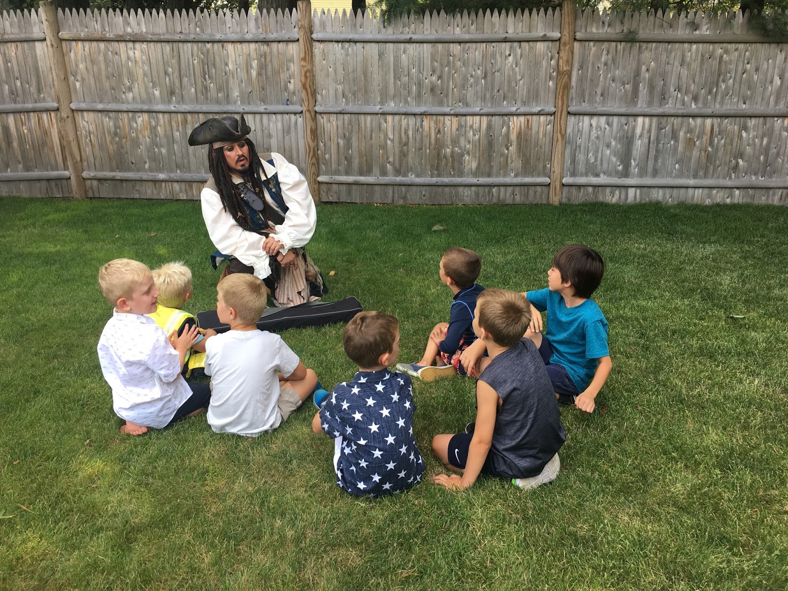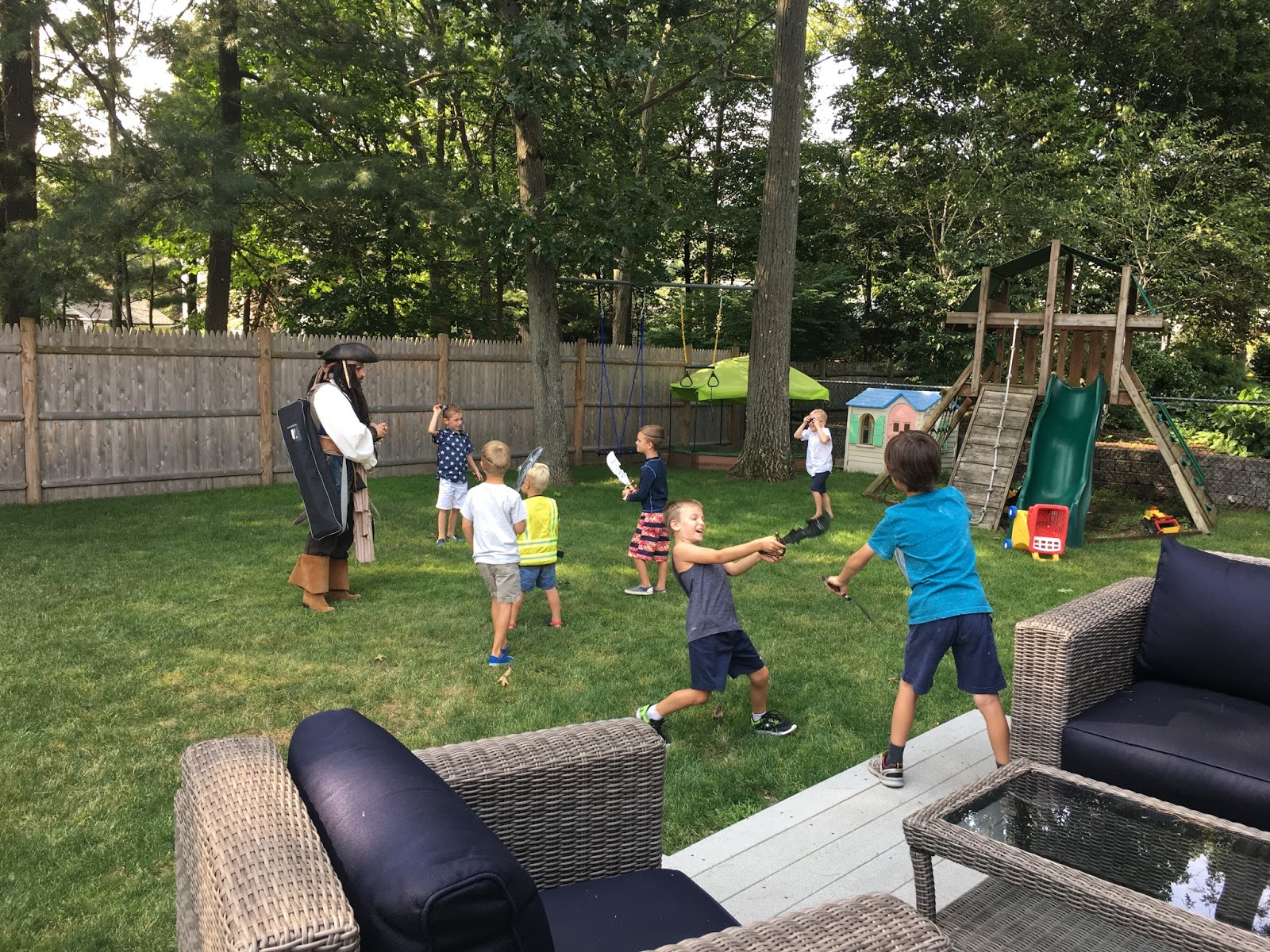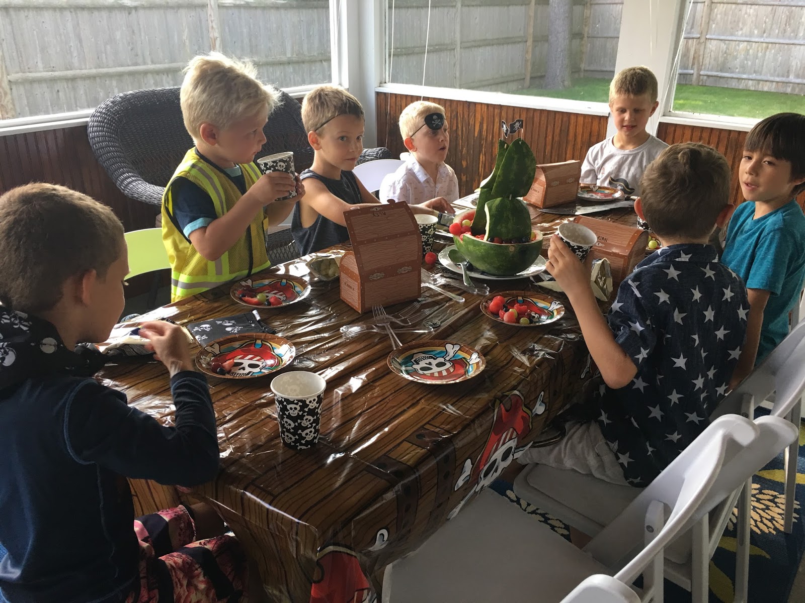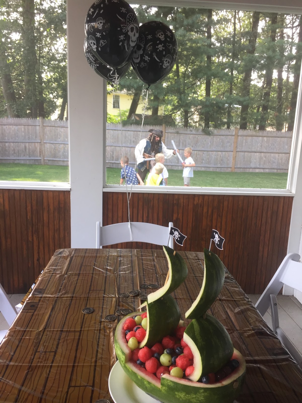 Ashton is obsessed with treasure and jewels. He has any number of small boxes that he collects things in – stray sequins he finds, buttons, pebbles, bolts, beads, tokens, anything. It did not take me long to decide to throw a pirate themed party for him. Mind you, it was nothing like last year. This one was super small and it was a drop-off! No parents meant no one to impress with decorations 😉 We did it in the afternoon so there wasn’t a huge food commitment AND I hired a Jack Sparrow lookalike to entertain the kids! (They haven’t seen any of the movies but easily recognized that he was a pirate.) It turned out to be a winning combination and I was practically stress-free. I ordered some swords and eye patches, carved a ship out of a watermelon, hung some balloons, and organized a treasure hunt for their favors but that was about it and it was glorious. Captain Jack was worth his weight in gold (no pun intended! HAHA). Not only did he look just like Johnny Depp, he even had the same voice and accent. He gave some swashbuckling lessons, played Simon Pirate Says, taught them about the code on the high seas, and best of all, they sat down in a circle for a Pirate Q&A and the kids could ask him any question they wanted. “Can you breathe underwater?” “Can you swim faster than a shark?” “Do you have real eyes?” and of course, because they are boys, “Where do you poop on a pirate ship?” They just kept going, it was priceless. [Captain Jack overall made quite the impression – the next night my friend texted me that he was all her kids could talk about and one of them kept pondering over and over, saying “I can’t tell if Captain Jack was a real pirate or just dressed up like one. He really seemed like one but why would a pirate be so nice to kids at a party?” LOL]