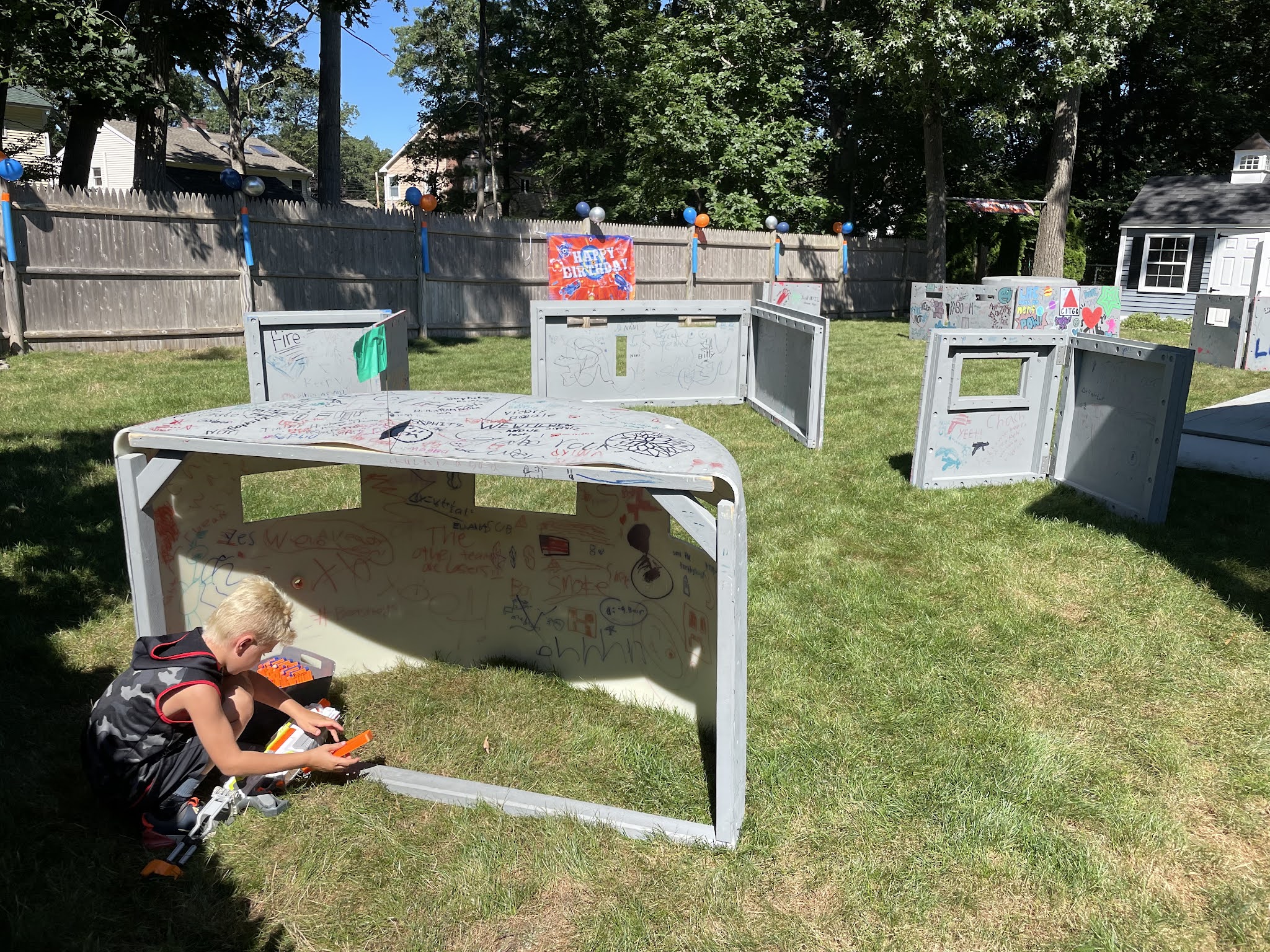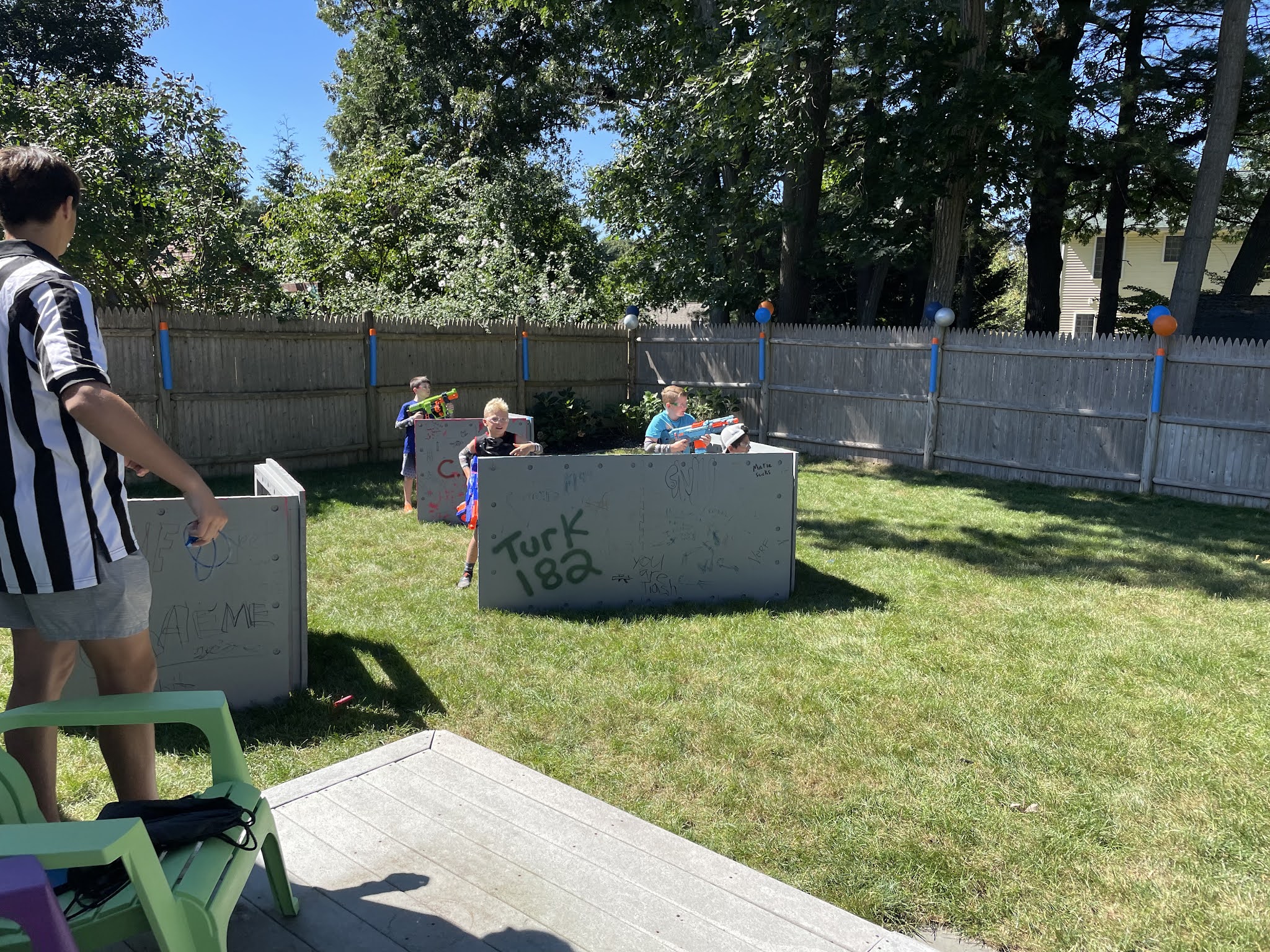 A couple truckloads later and our backyard was a Nerf war zone. I made giant darts as decorations from pool noodles and coffee cups, and we had customized water bottles, a pizza lunch, a referee (i.e. paid high school kid – I did not want to be the one calling kids out due to being shot) and even a balloon arch. The play was capture the flag style – two teams trying to infiltrate each others’ lines to grab the preciously guarded flag. Even the dads were in at one point.