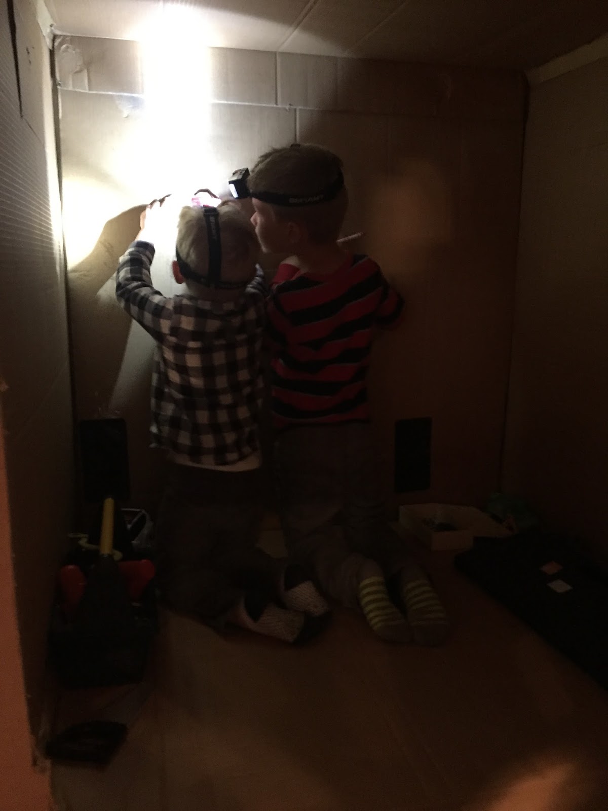 If you remember my last post, it was about two giant cardboard boxes in our living room that became a fort. I named it Naples. I predicted my Friday night would be especially easy with Naples around and she did not disappoint. Disaster nearly struck when I could not find any mini flashlights for the boys to take in there. Usually there are at least 20 of them in the junk drawer, but of course, Friday night, there were none. And our big flashlight takes a D battery, I mean who has D batteries on hand. Not me. So we went foraging into Jason’s work bench and ta-dah! Headlamps!
